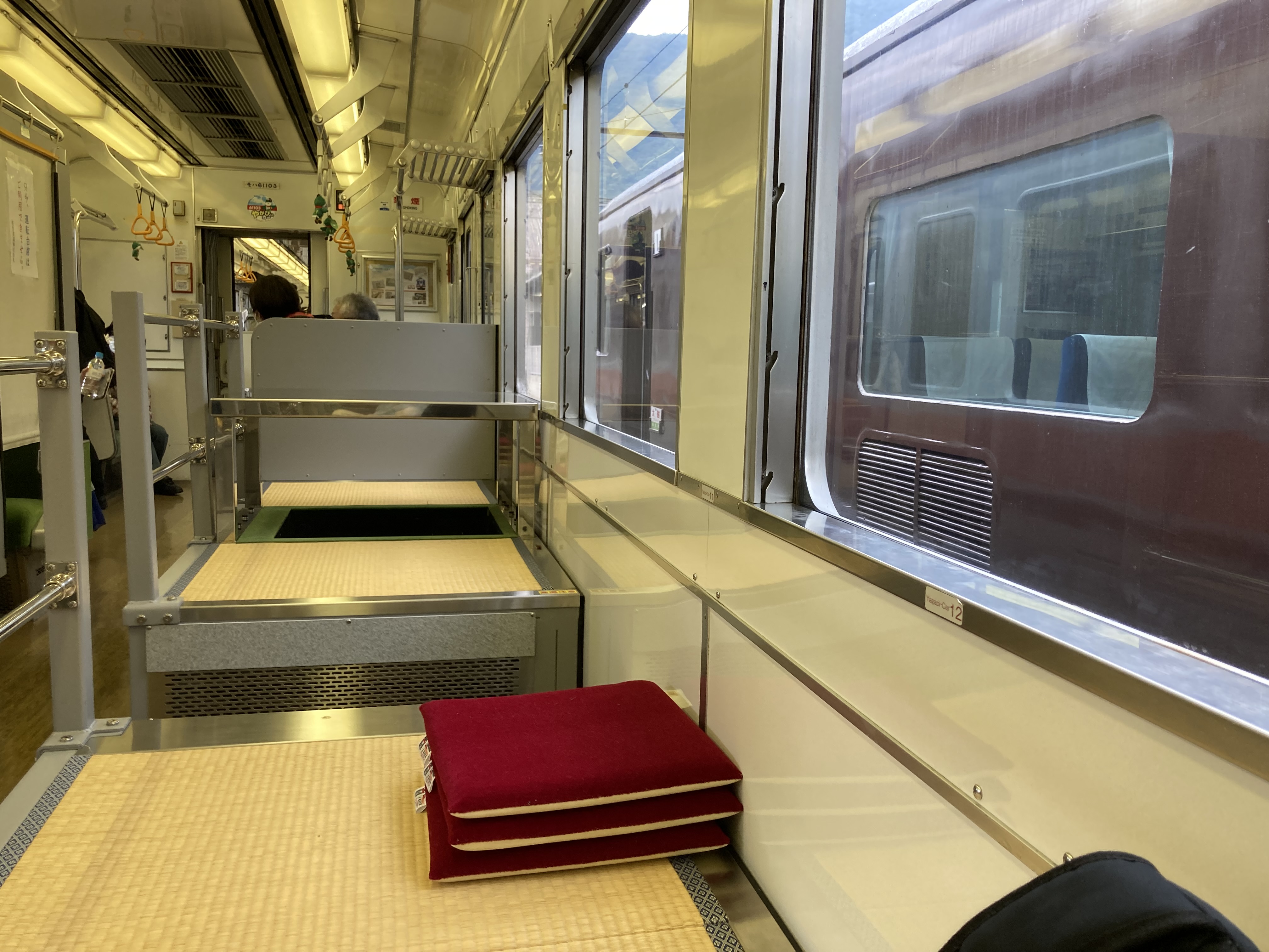 鬼怒川温泉駅で乗り換えたところ、なんと乗り換えた先の列車に畳張りの席があった!のんびりくつろぎながら車窓が見れて良い感じ。列車が山奥へ進むにつれて段々と乗客も少なくなり、ついには車両に1人、編成に3人みたいな状況に。こんな楽しい路線が無くならないと良いけれど…